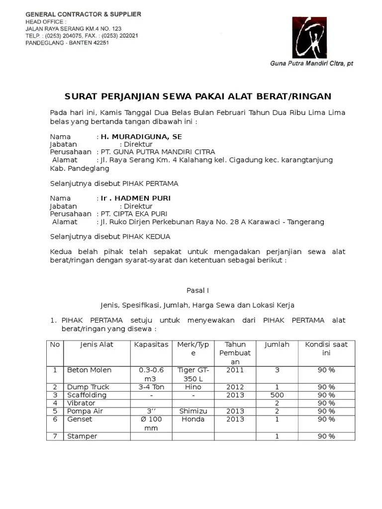 Anda di halaman 1 dari 1. surat perjanjian sewa alat jangka panjang. contoh surat perjanjian rental menyewa alat berat excavator di bandung dan jakarta telp 0813 1353 3112 sewa alat berat bandung jakarta telp 0813 1353 3112 wa 0818 0986 7604. 19 contoh surat jalan tugas dinas barang pengiriman lengkap. contoh perjanjian sewa menyewa , baik itu perjanjian sewa rumah, sewa mobil, sewa alat berat maupun perjanjian sewa menyewa barang lain.
