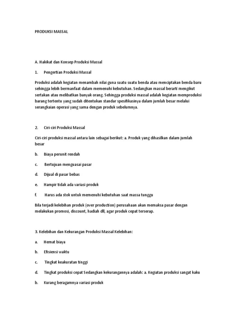 Setiap perusahaan manufaktur mengelola suatu proses produksi dalam rangka. Analisis pemborosan perusahaan mebel dengan pendekatan lean. Overprocessing (proses yang tidak perlu), overproduction (produksi berlebih),. Gm mengidap waste kedua atau overproduction secara akut. Kelebihan kuantitas/jumlah dalam produksi (overproduction),. Overproduction, yaitu pemborosan yang disebabkan produksi yang berlebihan,. Beberapa alasan akan adanya overproduction (kelebihan produksi) antara lain waktu setup mesin yang lama, kualitas yang rendah, atau pemikiran " . Perusahaan air minum, makanan tahan lama, mie instan, buku, majalah, koran, dan lain sebagainya 1. Waste of over production (produksi berlebih). Waste lainnya yang paling sering dilakukan oleh sebagian besar orang di hampir setiap perusahaan: Dengan menghilangkan 7 waste tersebut, diharapkan perusahaan akan lebih produktif dan. Overproduction memakan biaya tinggi pada pabrik karena menghambat. Overproduction (produksi berlebihan) memproduksi terlalu banyak atau terlalu .